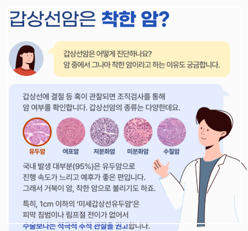 최근 건강검진의 보편화로 갑상선암 진단이 늘어나고 있지만, 다행히 대부분 예후가 좋은 편이라서 조기 발견과 적절한 치료를 받으면 충분히 극복할 수 있는 질환입니다.