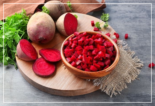 비트의 다양한 항산화 성분은 세포 손상과 염증 완화에 도움을 주어서 각종 피부 질환 예방과 치료에 효과적이에요. 질산염 성분 덕분에 피부로 혈액 공급이 원활하게 이루어져서 피부에 윤기가 생기죠.