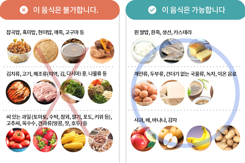 흰죽은 물에 불린 흰쌀을 푹 끓여서 소화가 매우 잘 되고, 장에 거의 잔여물을 남기지 않거든요. 카스테라나 푸딩 같은 부드러운 음식도 괜찮지만, 가장 안전한 건 역시 흰죽이랍니다. 반찬은 절대 먹으면 안 되고, 간장만 약간 넣어서 드세요.