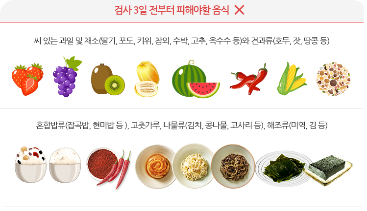 그래서 검사 3일 전부터는 특별한 식이요법을 시작해야 하는데, 섬유질이 많은 음식이나 씨가 있는 과일 등은 대장에 오래 남기 때문에 피해야 해요.
