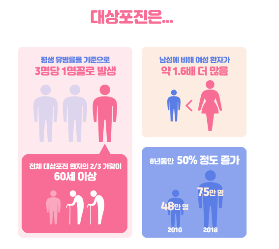 양쪽이 아닌 척추를 기준으로 왼쪽이나 오른쪽 중 한쪽에만 나타나는 것이 특징이에요. 발진이 생기기 1~5일 전부터 이런 통증이 시작되기 때문에, 단순 근육통으로 오해하기 쉽지만 한쪽에만 집중된다면 대상포진을 의심해봐야 해요.