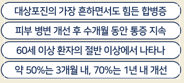 신경이 바이러스에 의해 손상되고 예민해져서 나타나는 증상이에요. 쿡쿡 쑤시거나 칼로 베이는 듯한 날카로운 느낌으로 나타나며, 샤워할 때 물줄기가 닿거나 바람만 스쳐도 아플 수 있어요.