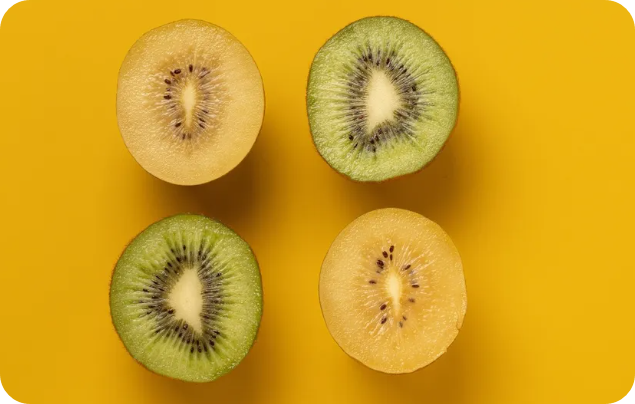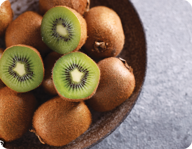 키위는 영양소 밀도가 매우 높은 과일로 100g당 그린키위는 38.2μg, 썬골드키위는 30.6μg의 엽산이 함유되어 있어 과일 중 최고 수준이에요.