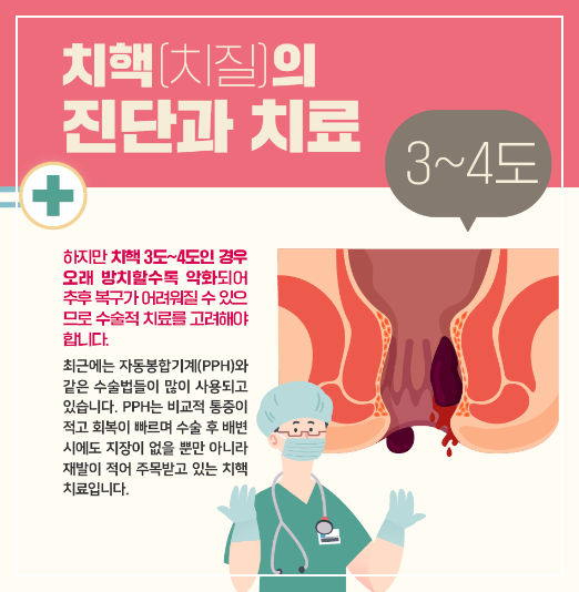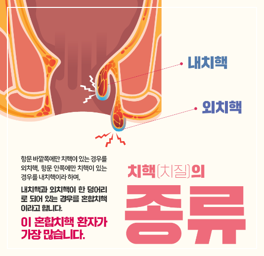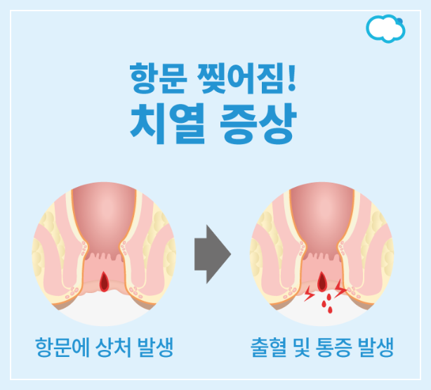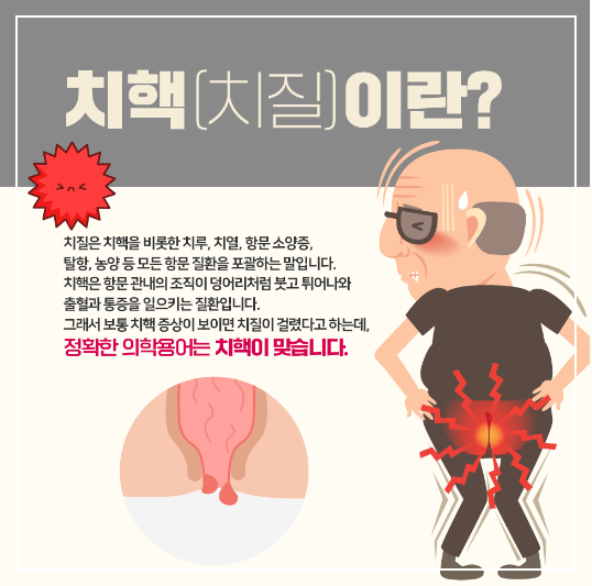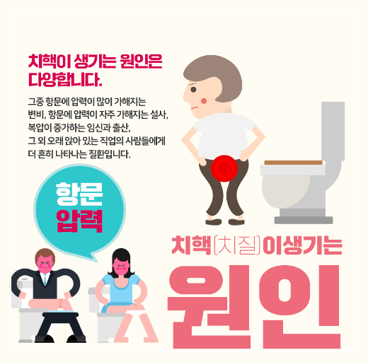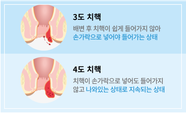 더 심하게 진행되면 혈액순환이 안 되면서 치핵 조직에 괴사가 생기는 경우도 있으니 조기에 대처하는 게 중요해요.