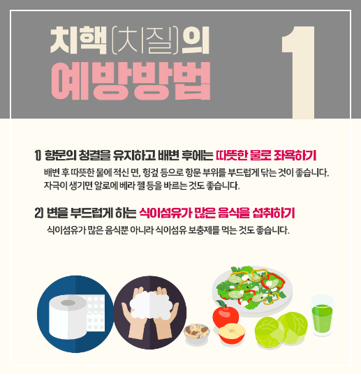 치질을 예방하려면 규칙적인 생활습관이 가장 중요해요. 섬유질이 풍부한 식단으로 변비를 예방하고, 하루 30분 정도 가벼운 산책이나 조깅으로 장 운동을 활발하게 해주세요.