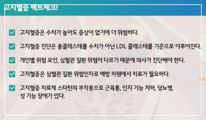 특히 나쁜 콜레스테롤이라 불리는 LDL 콜레스테롤이 높으면 혈관에 기름때가 끼며 동맥경화를 유발해서 협심증, 심근경색 같은 질환의 주요 원인이 되거든요.