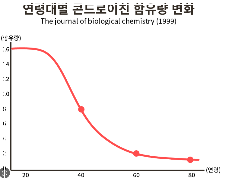 나이가 들수록 몸속에서는 연골을 분해하는 다양한 효소가 활성화되는데, 콘드로이친은 이들 효소의 작용을 억제해 연골 손상을 막아주는 효과가 있습니다. 과학적으로도 콘드로이친이 엘라스타아제, 콜라게나아제 등 연골 파괴 효소의 활성을 줄이는 것이 밝혀졌습니다.